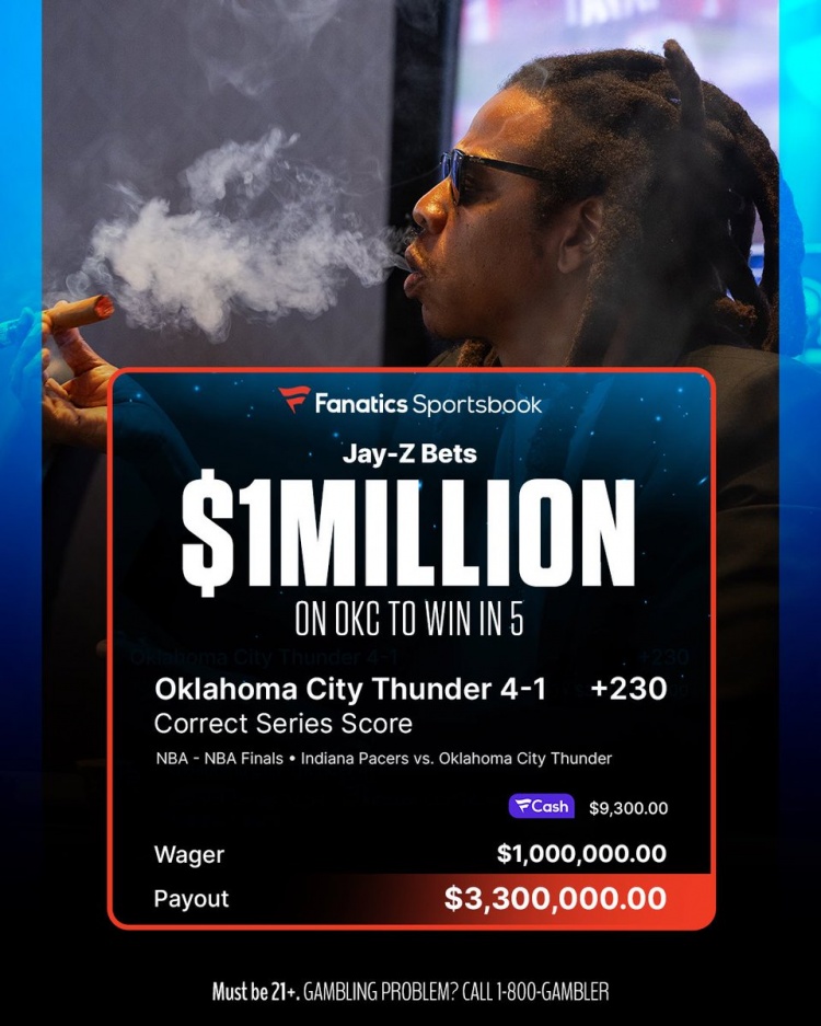 在总决赛打响前,说唱大亨、著名音乐制作人、商人Jay-Z曾在博彩网站Fanatics重金押注雷霆4:1夺冠,下注金额高达100万美元。根据Fanatics当时开出的赔率(+230),若预测成真,Jay-Z将获得330万美元的巨额回报。